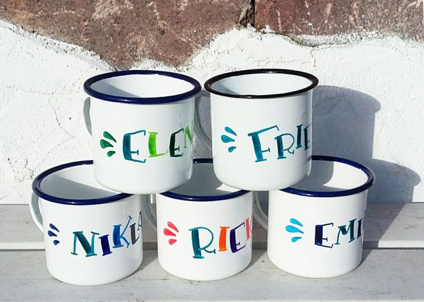Mit "Klecks und Gloria - Handlettering mit Herz" bin ich 2020 in die Selbstständigkeit gestartet. Mein neues Hobby hatte ich erst knapp ein Jahr zuvor für mich entdeckt und jede freie Minute damit gefüllt. Da ich neben dem Kleinkindmamatum nicht nur selbst sooo viel Freude mit dem Gestalten schicker Buchstaben hatte sondern auch begeisterte Rückmeldung von bis dato Beschenkten erhielt, entschied ich mich, eine familienbedürfnisorientierte Selbstständigkeit damit zu wagen. Am 16.11.2020 durfte ich meine erste offizielle Rechnung. Über fünf handbemalte Lettering-Emaille-Tassen, und zwar für genau diese hier: